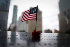 An American flag and red rose stand in the names of those lost at the edge of the south reflecting pool of the 9/11 Memorial & Museum ahead of the 20th anniversary of the 9/11 attacks in lower Manhattan in New York City, New York, U.S., September 8, 2021. REUTERS/Mike Segar