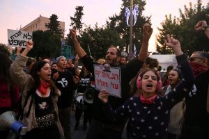 [Protesters shout slogans during a demonstration against the Israeli Prime Minister Benjamin Netanyahu’s alleged corruption, the postponement of his trial and his handling of the coronavirus disease (COVID-19) crisis, outside his residency in Jerusalem January 13, 2021. REUTERS/Ronen Zvulun]