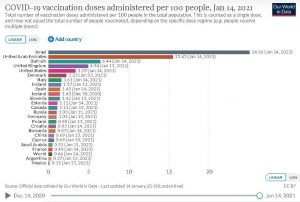 [COVID-19 vaccination doses administered per 100 people, Jan 14, 2021. Source: Our World in Data.]