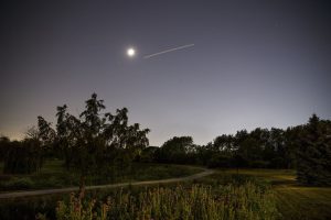 The moon above Centennial Park as an aircraft passes through the area on June 15, 2021, in Tinley Park. (Armando L. Sanchez/Chicago Tribune/TNS/ABACAPRESS.COM
