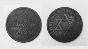 [Attribution: Medal issued by Goebbels’s newspaper Der Angriff commemorating head of SD Jewish Affairs Office Leopold von Mildenstein’s six-month visit to Palestine. Photos: Courtesy of Kedem Auction House]