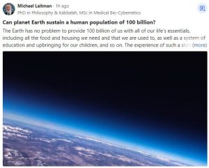 The Earth has no problem to provide 100 billion of us with all of our life’s essentials, including all the food and housing we need and that we are used to, as well as a system of education and upbringing for our children, and so on.
