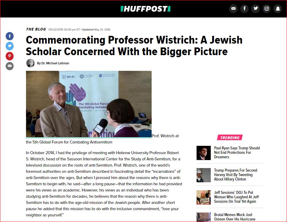 Representatives of the ARI institute, of which I am the president and founder, had a chance to meet with Prof. Wistrich at the 2015 Global Forum for Combating Antisemitism. In a conversation with a member of our delegation, he reiterated the tone and spirit of the wise words that I had heard from him before. Sadly, a few days after the conference, this luminary suffered a fatal heart attack in Rome, shortly before addressing the Italian Senate about the rise of anti-Semitism in Europe.