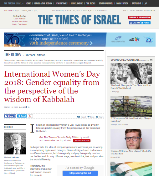 In light of International Women’s Day, I was asked to give my take on gender equality from the perspective of the wisdom of Kabbalah.