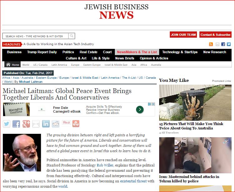 The growing division between right and left paints a horrifying picture for the future of America. Liberals and conservatives will have to find common ground and work together. Some of them will attend a global peace event in Israel this week to learn how to do it.