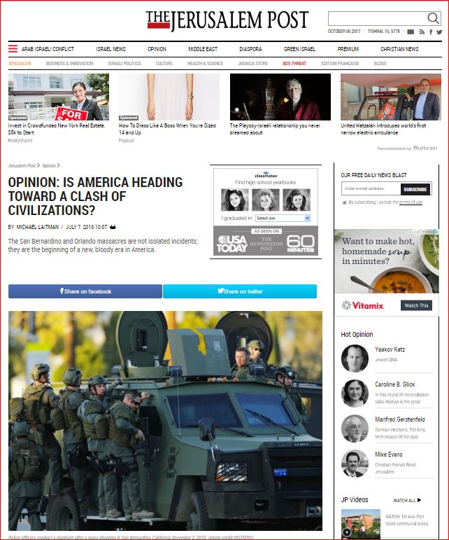 Just as it is currently doing in Europe, the newly imported Islam has come to take over, not to become part of America’s melting pot or even to coexist. The San Bernardino and Orlando massacres are not isolated incidents; they are the beginning of a new, bloody era in America: an era of a clash of civilizations where the more determined will win.
