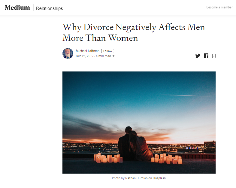 Marriage has been directly associated with men’s health. 66% of men rely on their wives for their primary social support. Thus, divorce greatly increases a man’s sense of isolation. Also, socially isolated men have an 82% higher risk of dying from heart disease.