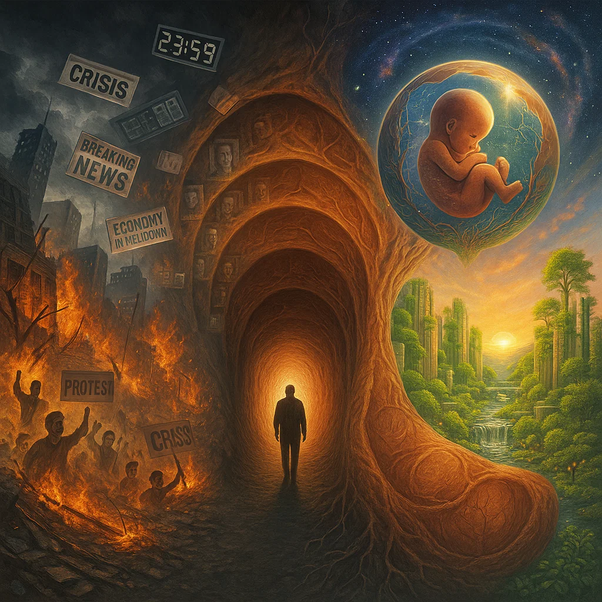 Such a state resembles that of a fetus before birth. Throughout pregnancy, the fetus develops safely inside the mother’s womb. But as the moment of birth approaches, a process of intense mutual pressure occurs. The fetus must leave, and the mother can no longer contain it. They experience a mutual rejection, and thus labor begins. In the end, the baby becomes born into a world that welcomes it with love and offers a new, elevated level of life: it becomes a human being.