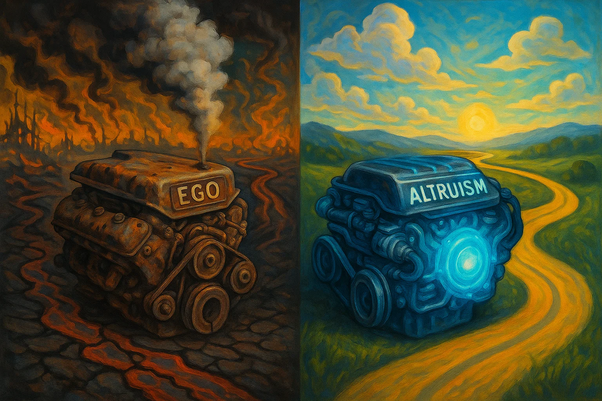 Our “egoistic engine” has long propelled us into more advanced stages of development. Like driving a car with five gears, we moved from first to second, to third, to fourth, and to fifth. But when we reached the fifth gear and pressed the gas pedal all the way down, it is as if the engine has stopped. We suddenly discover that we cannot keep moving forward with the same engine.