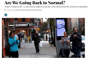 Like never before, we are on the verge of a historic breakthrough. As humanity impatiently awaits the reopening of society and businesses, we should not become nostalgic about the past. Returning to what we call “normal” would be returning to the abnormal state that constantly left us unfulfilled, chasing unrealistic goals, and immersed in exhausting competition to succeed at all cost. However, since the old, egoistic patterns have proven themselves unworkable, it is worthwhile to look forward to welcome change, instead of backward. Ultimately, the current crisis has come to raise us and all of creation to a higher level of existence, so we would be wise to flow with the harmonious power of nature and allow it to heal us.