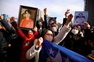 [Myanmar protesters residing in Japan hold photos of Aung San Suu Kyi as they rally against Myanmar’s military after seizing power from a democratically elected civilian government and arresting its leader Aung San Suu Kyi, in Tokyo]