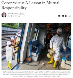 “Most of all, Coronavirus is teaching us a lesson in mutual responsibility. It is forcing us to recognize the painful fact that we are interconnected and interdependent the world over.”