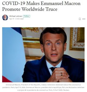 Now that the superbug has taught us about Earth, it is beginning lesson no. 2. Incredibly, French president Emmanuel Macron has initiated an agreement to back a call by the UN Secretary-General Antonio Guterres for a global ceasefire. Even more incredible, his initiative quickly secured the backing of four out of the five permanent members of the UN Security Council: China, the US, the UK, and of course France. Russia, Macron hopes, is likely to express its support in the coming days.