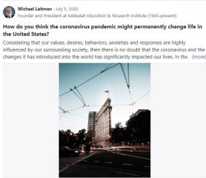 If we relate to the coronavirus as a lesson from nature—a lesson in becoming more considerate and responsible toward each other, doing away with our excessive consumeristic drives that distanced us from each other and nature—and instead focus our sources of enjoyment not in what a materialistic society promotes to us, but in developing positive connections to each other, then we would make good use of this period and experience its permanent changes positively.