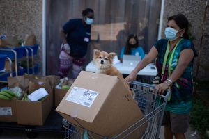 [Reuters: Woman and dog leave with groceries distributed to residents affected by economic fallout from coronavirus disease in Houston]