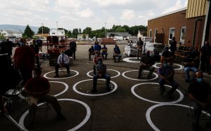 [Workers separated for social distancing because of the coronavirus (COVID-19) pandemic listen to Democratic U.S. presidential candidate and former Vice President Joe Biden as he speaks about the U.S. economy during an outdoor campaign event at McGregor Industries, a metal works plant that manufactures stairs and stair railings, in Dunmore, Pennsylvania, U.S., July 9, 2020. REUTERS/Tom Brenner]