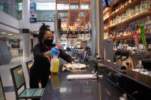 FILE PHOTO: A woman cleans and disinfects a bar at a restaurant at Terminal E of IAH George Bush Intercontinental Airport amid the coronavirus disease (COVID-19) outbreak in Houston, Texas, U.S., July 21, 2020. REUTERS/Adrees Latif