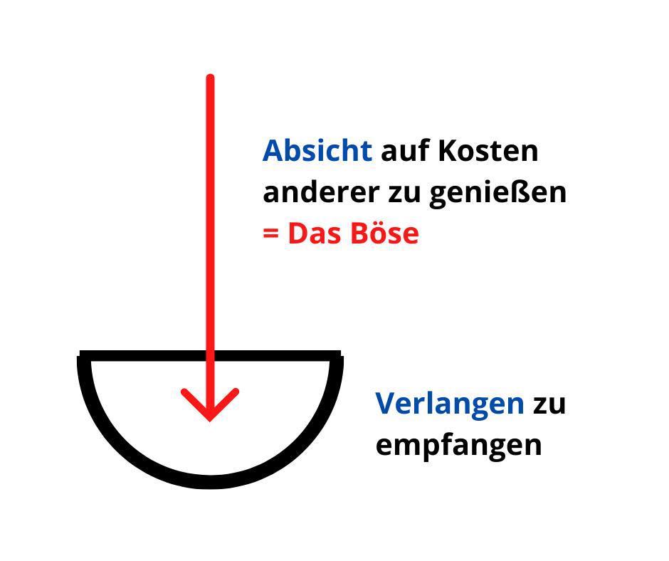 Während also der Wunsch zu genießen unserer Natur entspricht und wir ständig den Impuls verspüren, uns dem Genuss zuzuwenden und uns vom Leid zu entfernen, kommt das Böse ins Spiel, wenn unser Wunsch beginnt, auf Kosten anderer zu genießen, d.h. wenn wir uns über andere stellen und sie erniedrigen.