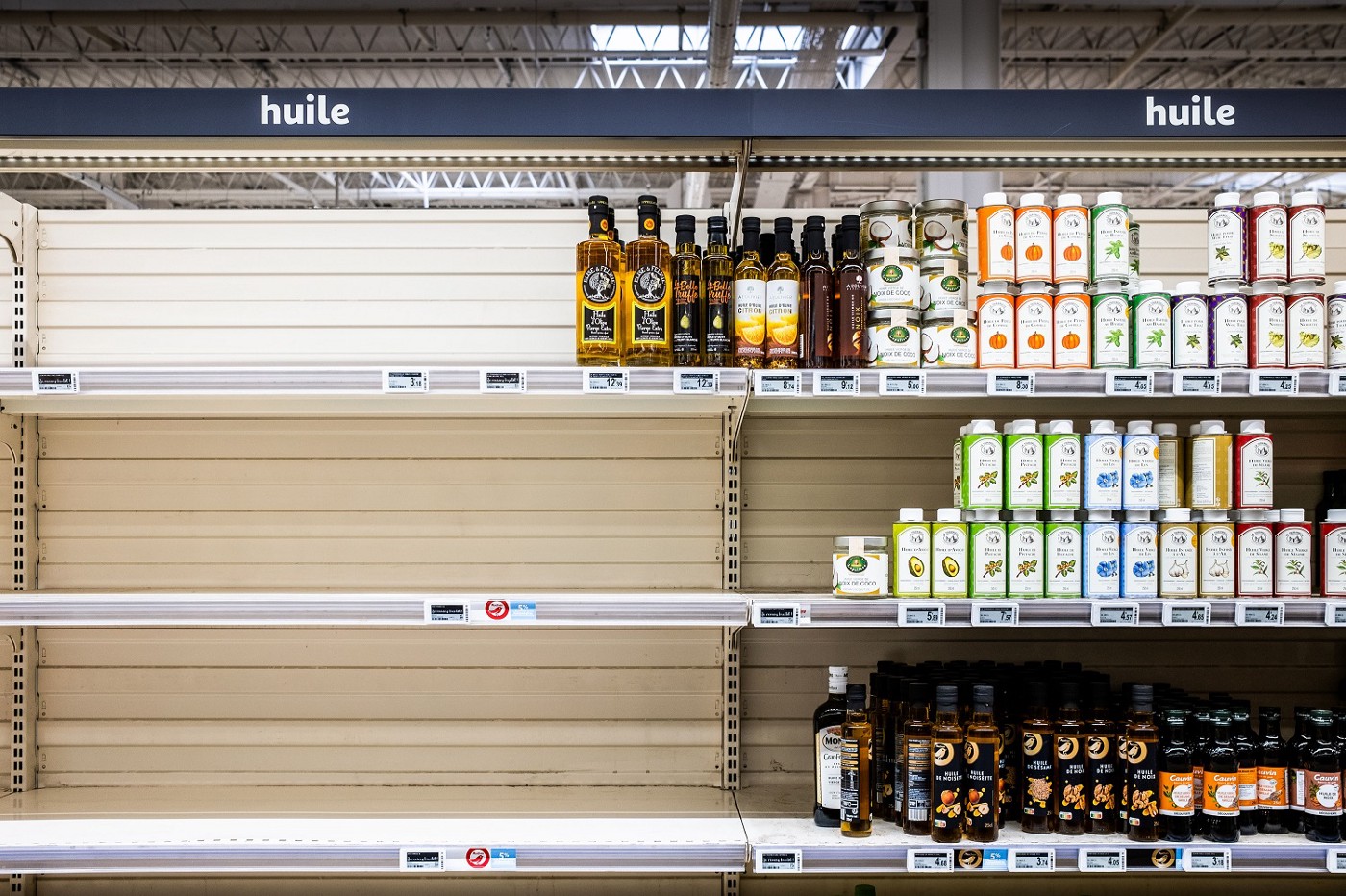 FRANKREICH – Perpignan, 23. April 2022, Supermarktregale. Rayon-Öl. Sonnenblumenöl ist knapp und leer, es gibt kein Produkt im Regal, aber andere Pflanzenöle sind vorhanden (Reuters)]