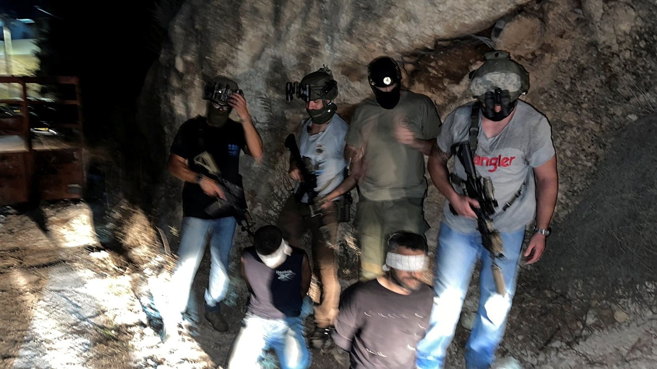 Las fuerzas de seguridad israelíes, junto a los militantes palestinos Zakaria Zubeidi y Mahmoud al-Arda, arrestados después de su fuga, junto con otros cuatro militantes, de la prisión de Gilboa, en la aldea israelí de Umm Al Ghanam, Israel, 11/sep/21. Policía israelí / Folleto vía REUTERS