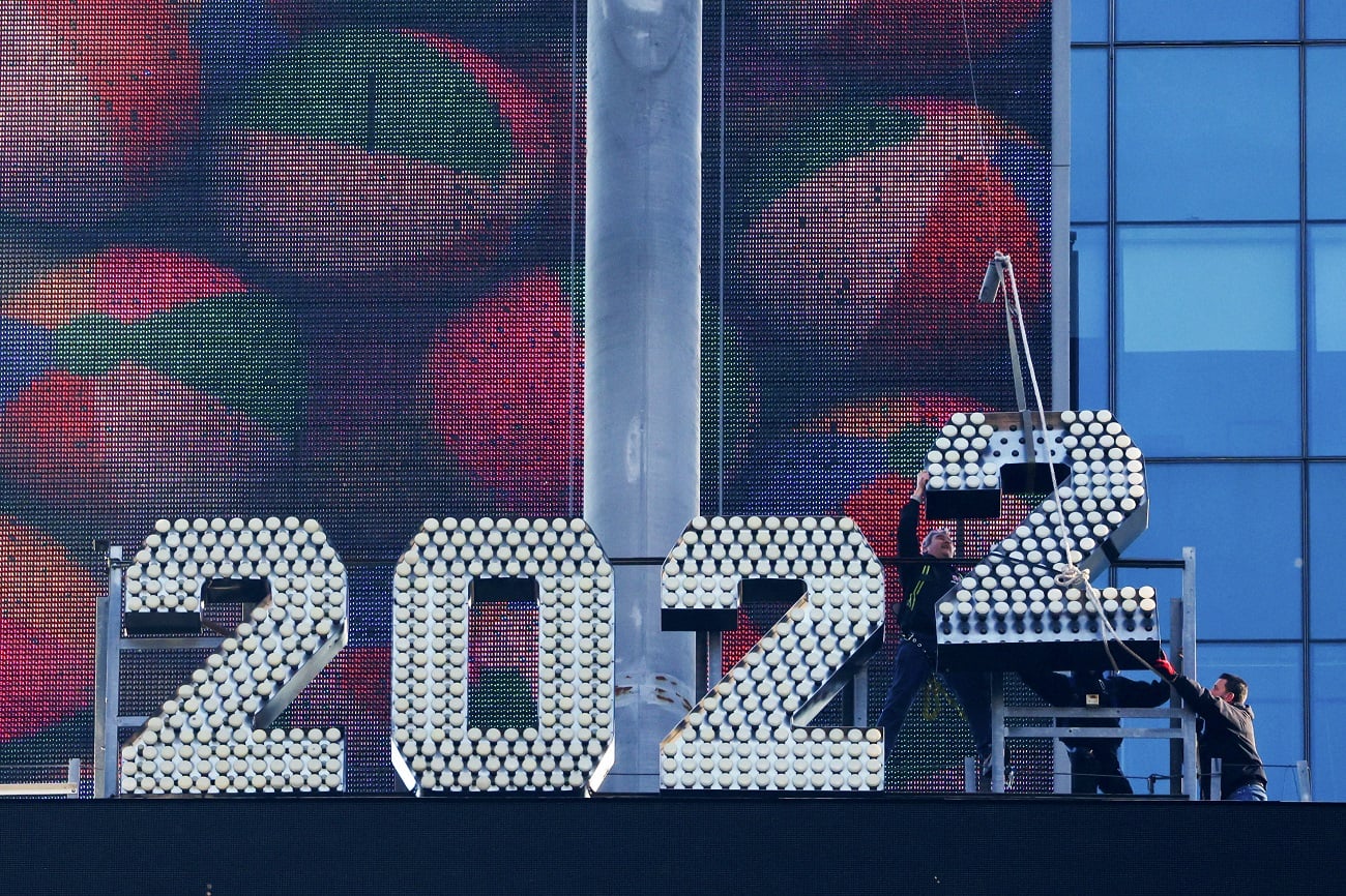 Trabajadores agregan el número 2 a los números del año, en Times Square antes de las celebraciones de Nochevieja en Manhattan, Nueva York, EUA, 26/dic/21. REUTERS / Andrew Kelly