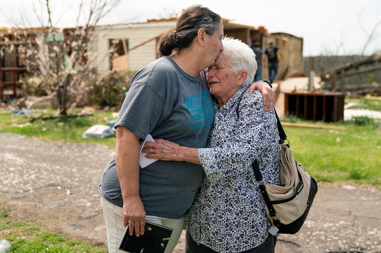 [Mary Umetsu, a la izquierda y la amiga de la familia Carol Cunningham, derecha, se abrazan. Cunningham se emociona afuera de la casa dañada de Umetsu el día después de que una serie de tornados causó varias muertes en Ohatchee, Alabama, EUA, 26/mar/21. REUTERS / Elijah Nouvelage]