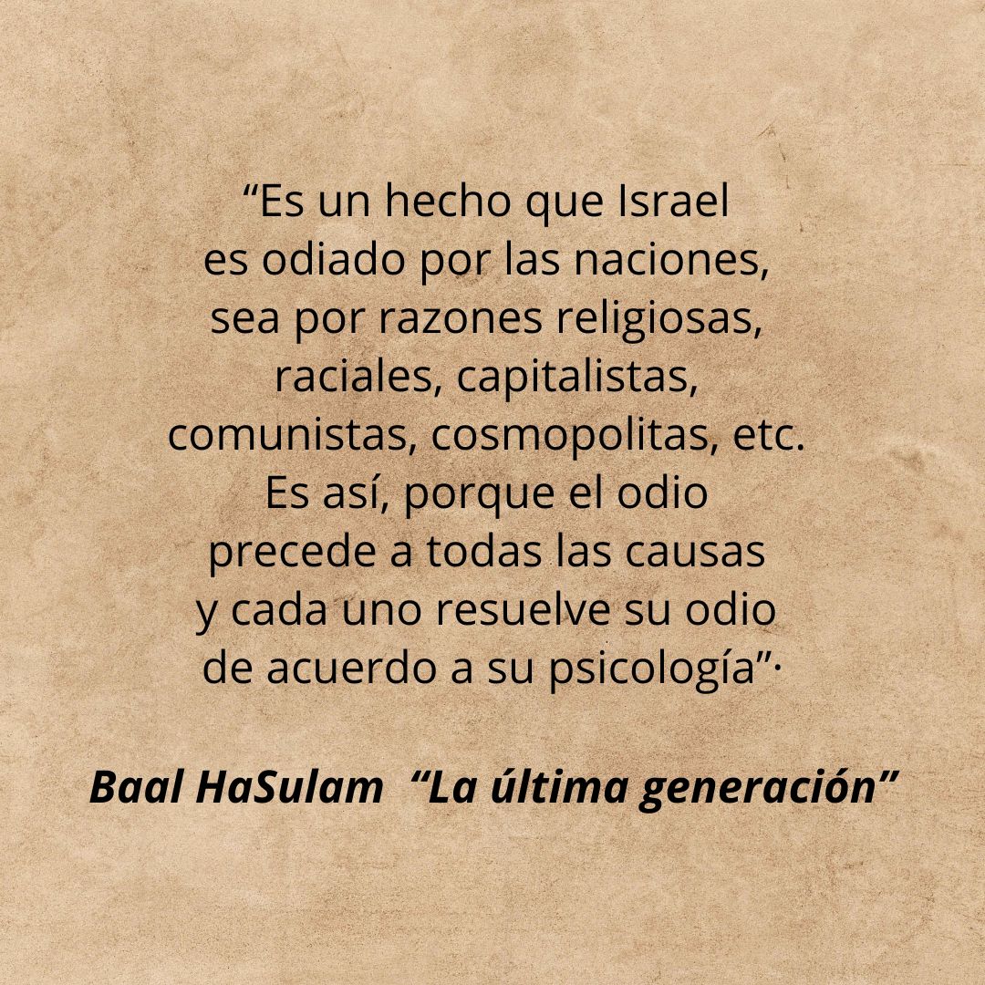 El cabalista Yehuda Ashlag (Baal HaSulam) escribió en su ensayo Escritos de la última generación: “Es un hecho que Israel es odiado por las naciones, sea por razones religiosas, raciales, capitalistas, comunistas, cosmopolitas, etc. Es así, porque el odio precede a todas las causas y cada uno resuelve su odio de acuerdo a su psicología”·
