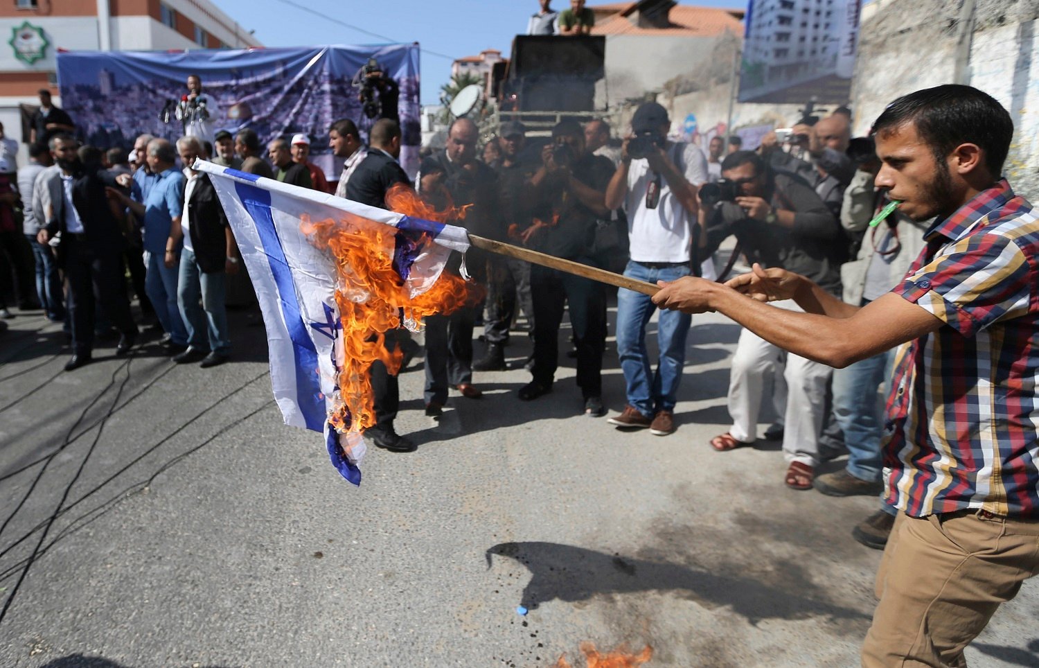 Foto: Un palestino quema una bandera israelí, durante una manifestación para mostrar su solidaridad con la mezquita de al-Aqsa, en la ciudad de Gaza, 17/oct/14. (Reuters)