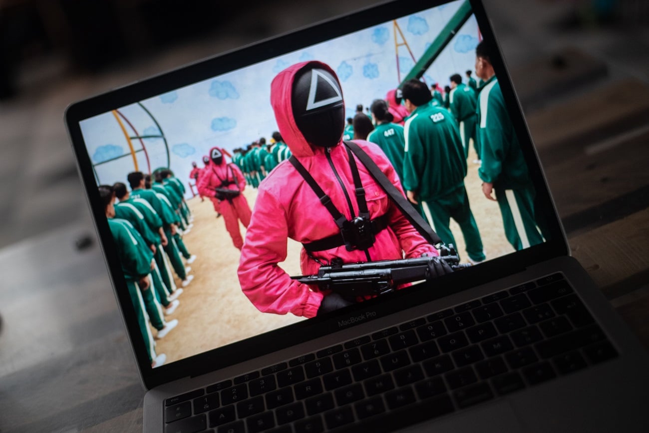 Viendo la serie de juegos del calamar de Netflix en una computadora portátil. Fotografía de Romain LONGIERAS/Hans Lucas. Francia, Excideuil, 6/oct/21
