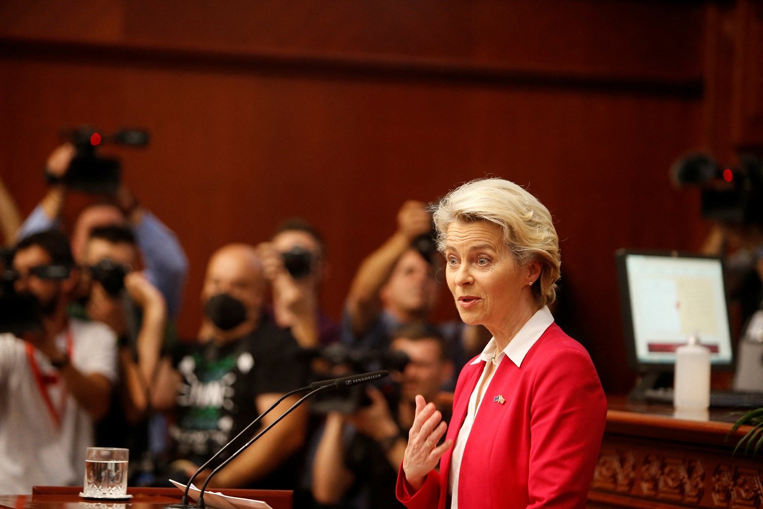 Foto: Ursula von der Leyen, presidenta de la Comisión Europea, se dirige a la Asamblea de Macedonia del Norte, en Skopje, Macedonia del Norte, 14/jul/22. REUTERS/Ognen Teofilovski.