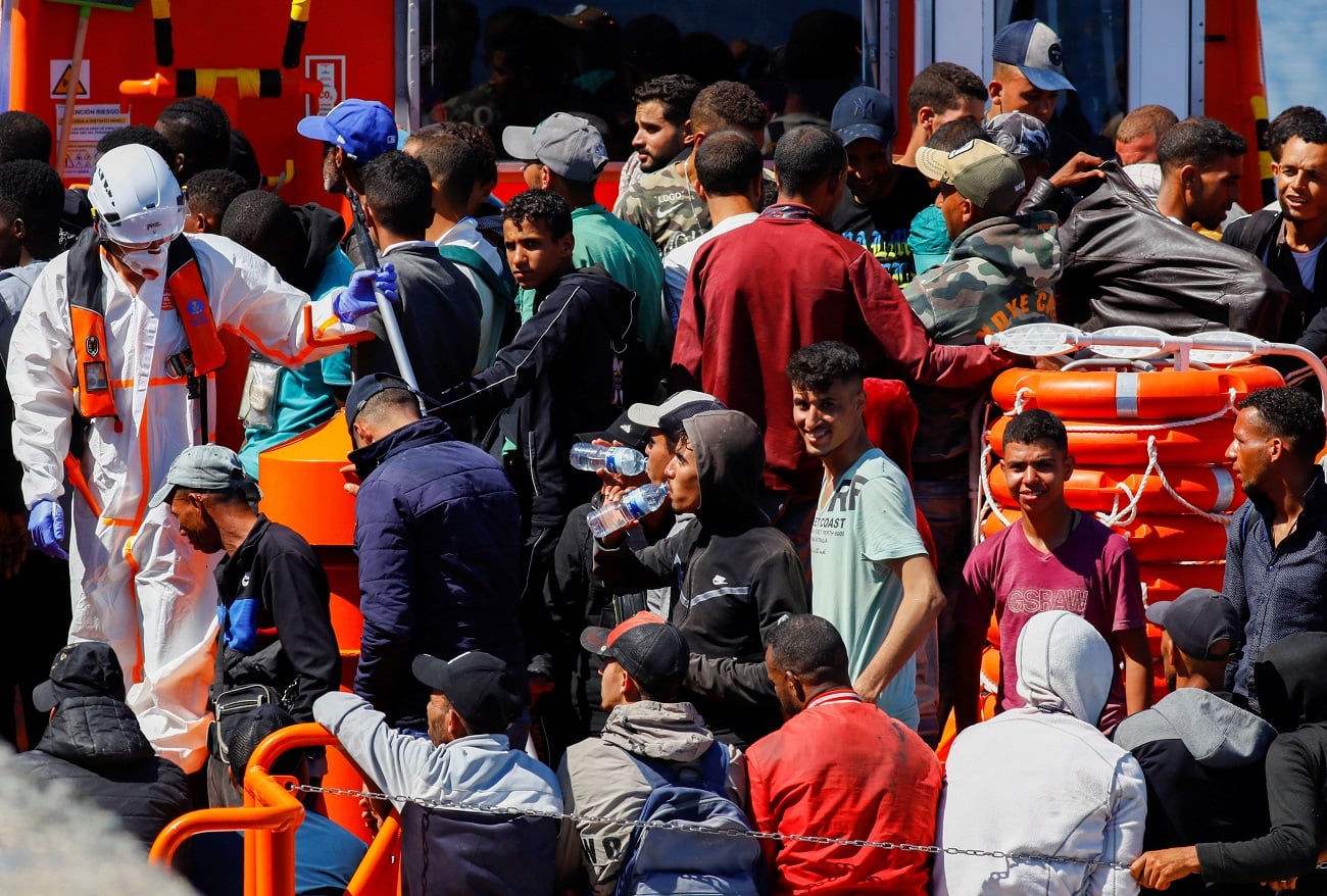 Migrantes esperan para desembarcar de un buque guardacostas español, en el puerto de Arguineguín, en la isla de Gran Canaria, España, el 15 de septiembre de 2021. REUTERS Europa / Borja Suarez