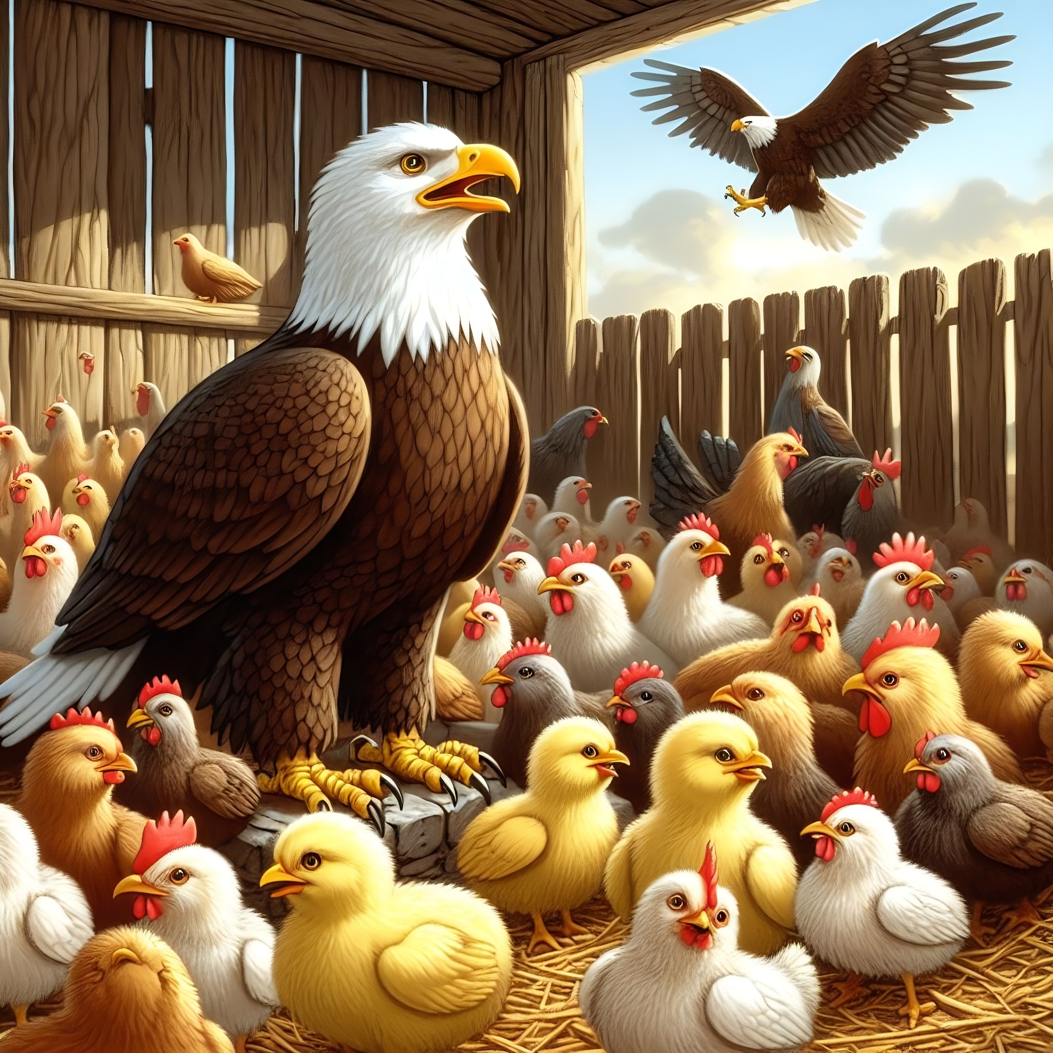 Una vez, un hombre encontró un huevo de águila y lo puso entre los de las gallinas. El aguilucho creció junto con los polluelos. Como ellos, cloqueaba y arañaba el suelo, buscaba gusanos, batía las alas e intentaba volar. Un día, ya águila adulta, vio un pájaro orgulloso en el cielo. El pájaro volaba batiendo sus enormes alas.