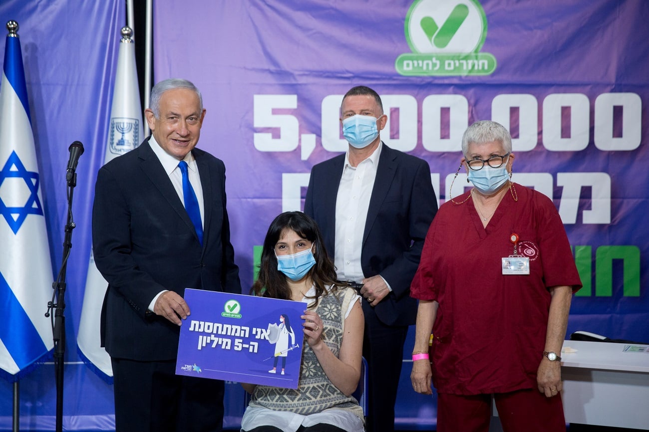 [Primer ministro israelí Benjamín Netanyahu y Ministro de Salud Yuli Edelstein con el ciudadano israelí número 5 millones en recibir la vacuna Pfizer-Biontech Coronavirus (COVID-19), Tel Aviv, Israel, 8/mar/21. Miriam Alster / Pool via Reuters]