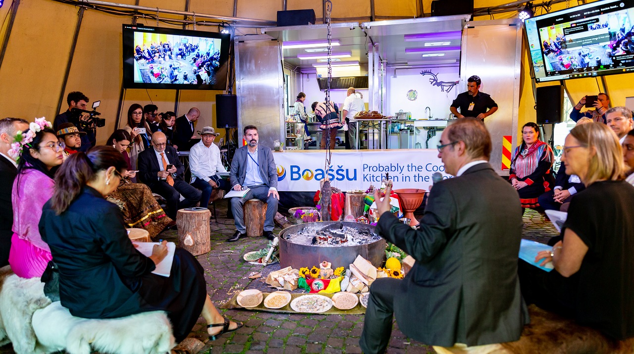Foto: Participantes en la carpa de los pueblos indígenas, junto al fuego, durante el debate sobre los sistemas alimentarios de los pueblos indígenas, en el segundo día del II Foro Mundial de la Alimentación, organizado por la Organización de las Naciones Unidas para la Agricultura y la Alimentación, en la sede de la FAO en Roma, Italia, 18/oct/22. El Foro Mundial de la Alimentación es una nueva iniciativa que se centra en la seguridad alimentaria mundial, La idea principal del foro de este año es: Dietas saludables. Planeta sano. (Foto de Dominika Zarzycka/Sipa USA)