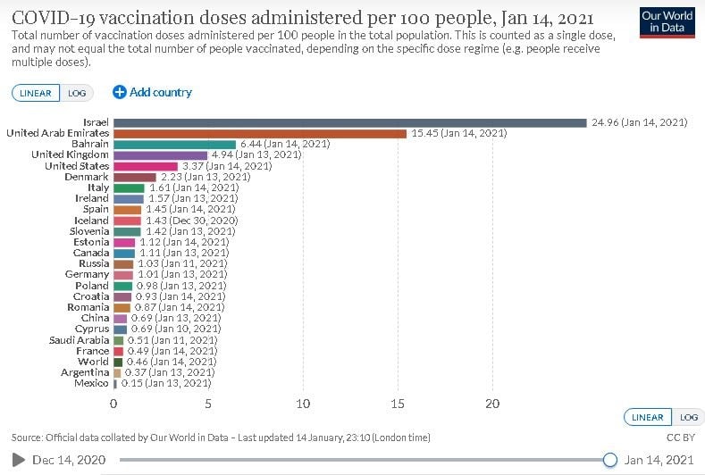 Dosis de vacunación COVID-19 administradas por cada 100 personas, 14/ene/21. Fuente: Our World in Data.