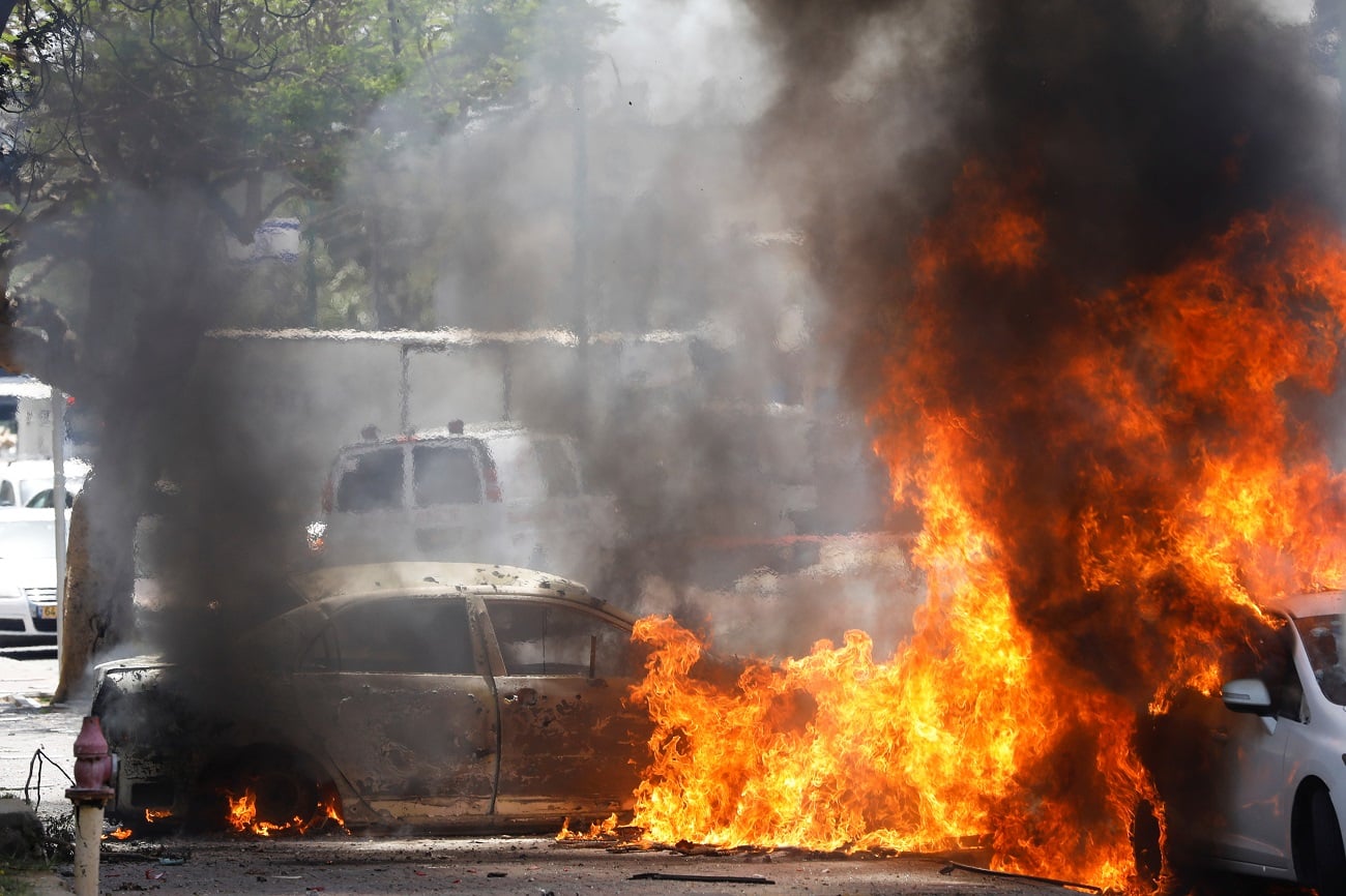 [Automóviles se incendian después de que un cohete lanzado desde la Franja de Gaza cayó cerca de Ashkelon, en el sur de Israel, 11/may/21. REUTERS / Nir Elias]