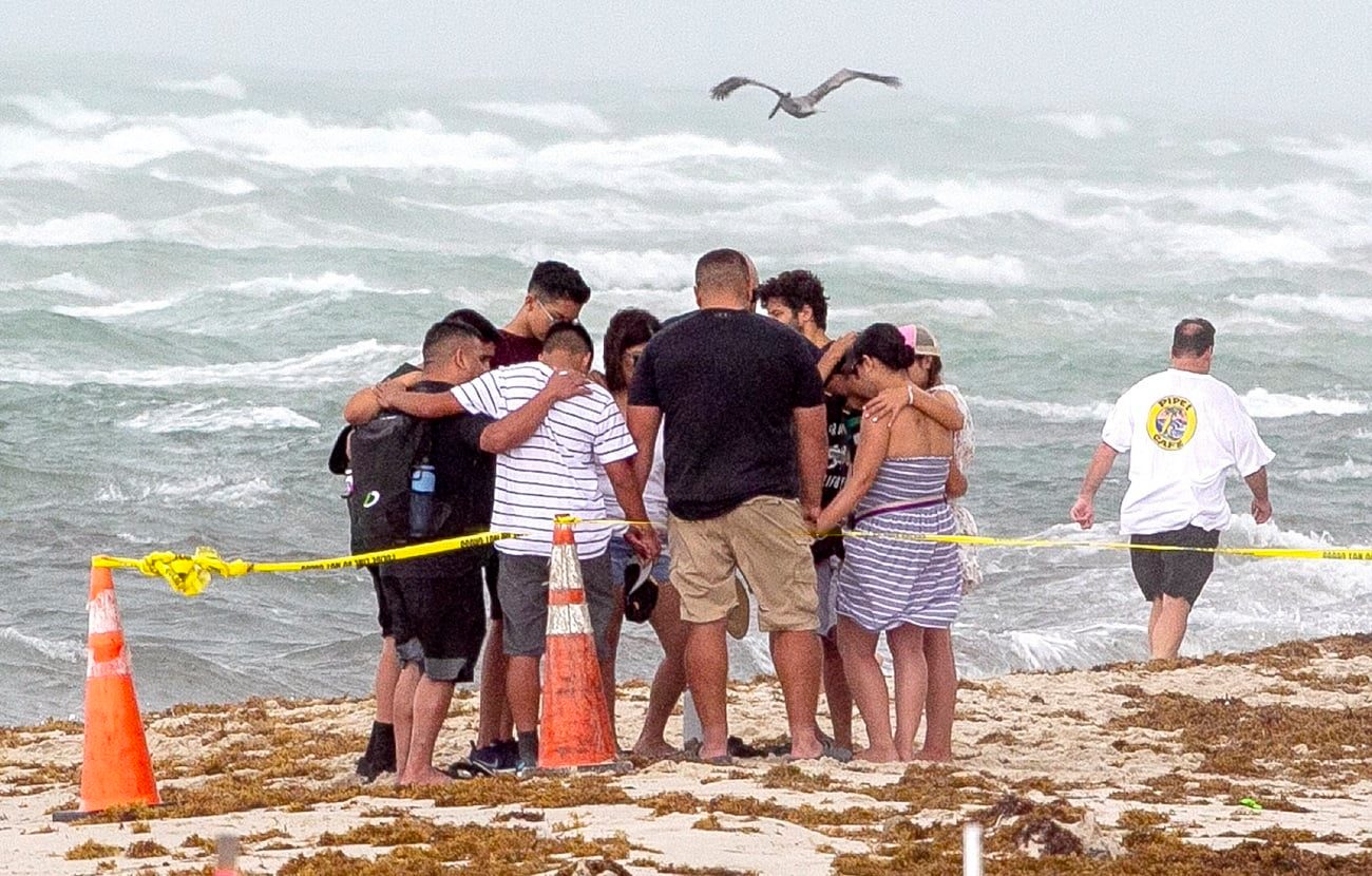Un grupo rezan juntos en la playa junto al sitio del condominio Champlain Towers South en Surfside, viernes 25/jun/21. Foto de Pedro Portal / Miami Herald / TNS / ABACAPRESS
