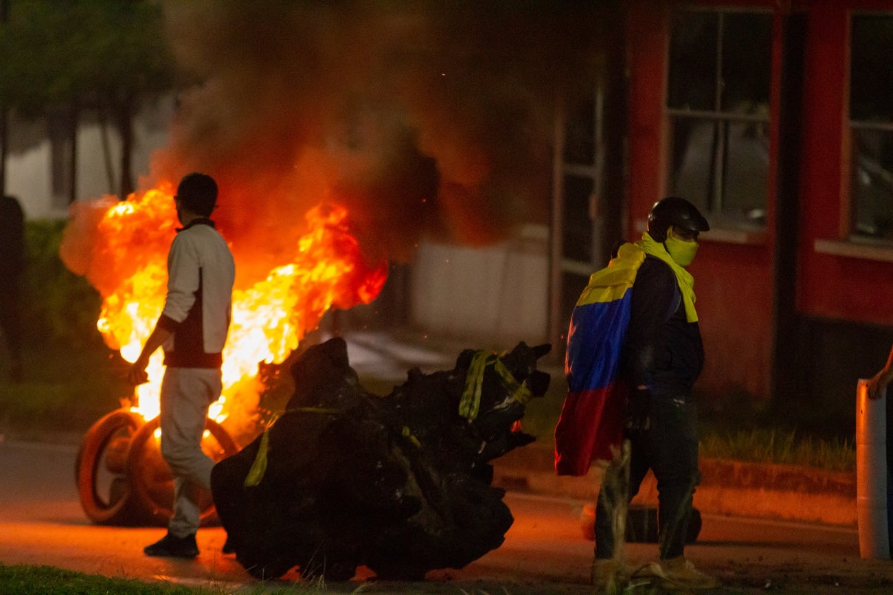 Un manifestante con una bandera colombiana, pasa frente a una barricada hecha de llantas en llamas, mientras la gente choca con la policía colombiana, antidisturbios (ESMAD) en la carretera que conecta Cartago, Valle del Cauca con la ciudad de Pereira, Risaralda, Colombia 11/jun/21 Foto de Sebastián Osorio / Long Visual Press / ABACAPRESS.COM