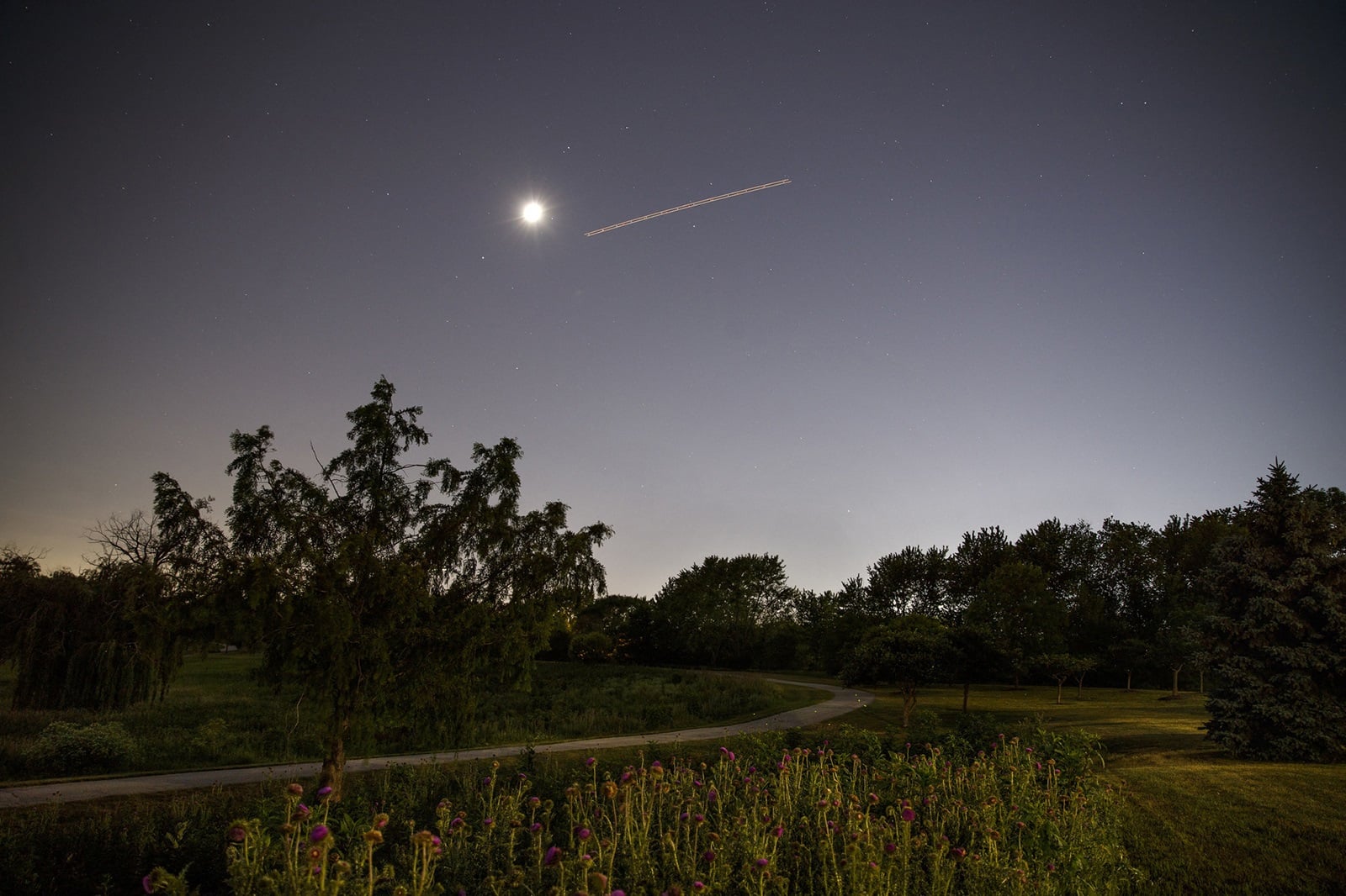 La luna sobre Centennial Park mientras un avión atraviesa el área 15/jun/21 en Tinley Park. (Armando L. Sánchez / Chicago Tribune / TNS / ABACAPRESS.COM