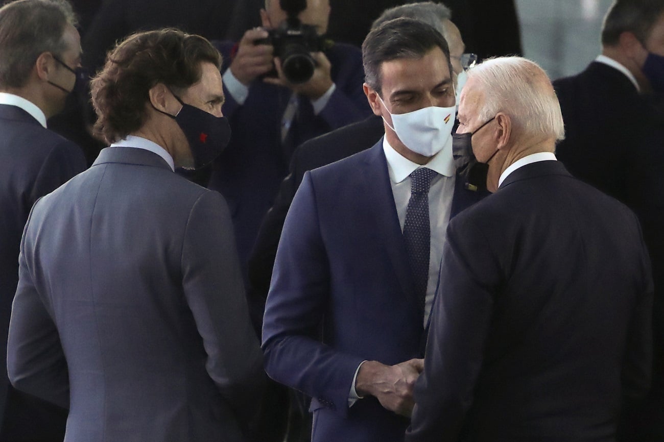 Joe Biden, presidente de EUA, Pedro Sánchez, presidente de España y Justin Trudeau, primer ministro de Canadá, hablan durante la cumbre de la OTAN en la sede de la Alianza, en Bruselas, Bélgica, 14/jun/21. REUTERS / Yves Herman / Pool.