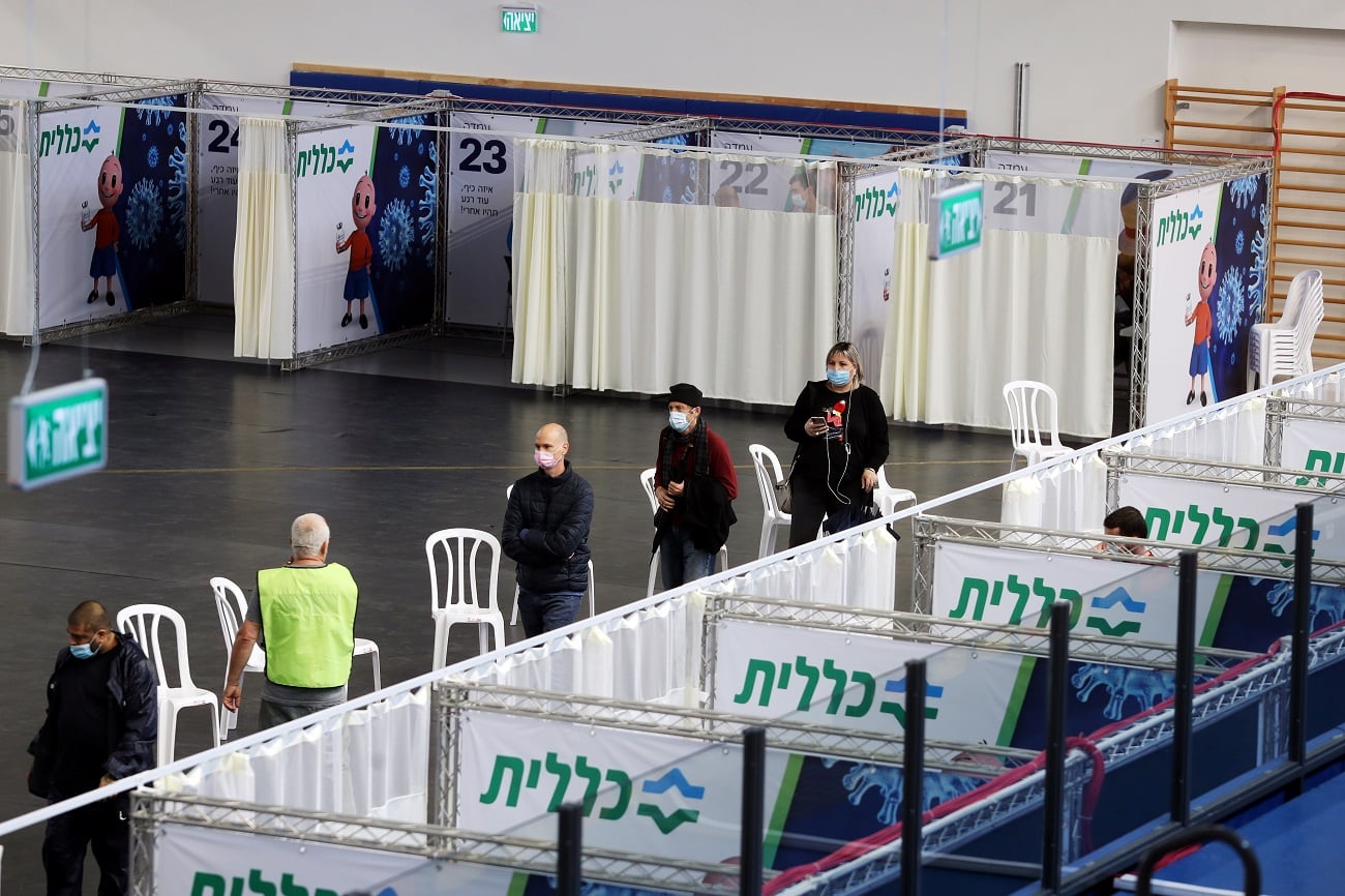 [Personas haciendo cola para recibir la vacuna contra el coronavirus (COVID-19) en un centro temporal de la organización de mantenimiento de la salud (HMO) de Clalit, en una cancha de básquetbol en Petah Tikva, Israel, 28/ene/21. REUTERS / Ammar Awad]