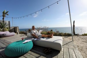 Michael Antonorsi, Chief Joy Activator at Chuao Chocolatier, goes over some documents as he works from his beachfront home during the outbreak of the Coronavirus (COVID-19) in Leucadia, California, U.S., June 17, 2020. REUTERS/Mike Blake