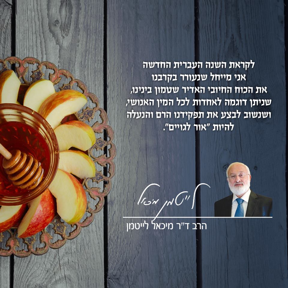 כשראש השנה ניצב בפתח, ברצוני לאחל לכולנו את מה שהכי חסר לנו – קשר, קרבה בינינו, אהבה! זה תמיד הציל את העם שלנו, זה נמצא בקוד, בכרומוזומים של העם. "ואהבת לרעך כמוך" – עלינו לממש את זה בינינו ובעולם. שנה טובה! 🍎🍯