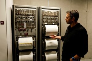 A worker stands by an antiquated seismograph during a demonstration of a new earthquake early warning system which triggers sirens if a nationwide network of 120 seismic monitoring stations detects a strong earthquake at the Geological Survey of Israel in Jerusalem February 7, 2022. REUTERS/Amir Cohen