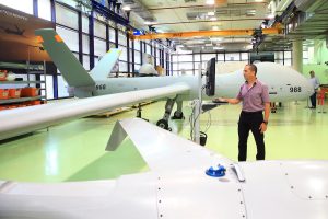 An employee looks at a computer screen as he stands next to an Elbit Systems Ltd. Hermes 900 unmanned aerial vehicle (UAV) at the company’s drone factory in Rehovot