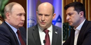 A combo photo of (L-R) Russian President Vladimir Putin, Israel Prime Minister Naftali Bennett and Ukraine President Volodymyr Zelensky. Naftali Bennett secretly traveled to Moscow on Saturday March 5, 2022 for a meeting with Russian President Vladimir Putin to discuss the war in Ukraine. The meeting at the Kremlin lasted for 3 hours, according to Israeli press reports. An Israeli official diplomatic source said the meeting was coordinated with the United States, Germany, and France, in continuous dialogue with Ukraine. Following the meeting with Putin, the Prime Minister’s Office said Bennet spoke with Ukraine’s President Volodymyr Zelensky. It did not specify what the two discussed