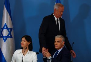 Israeli Defence Minister Benny Gantz, Israeli Defence Minister Benny Gantz and Israeli Energy Minister Karine Elharrar attend a news conference after Israel’s cabinet endorsed a U.S.-brokered deal to delineate a maritime border with Lebanon, at the Prime Minister’s office in Jerusalem, October 12, 2022. REUTERS/Ronen Zvulun