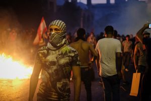 A demonstrator watches clashes between security forces and young Lebanese, during the first anniversary of the Beirut port explosion. Beirut, Lebanon, August 4, 2021 (