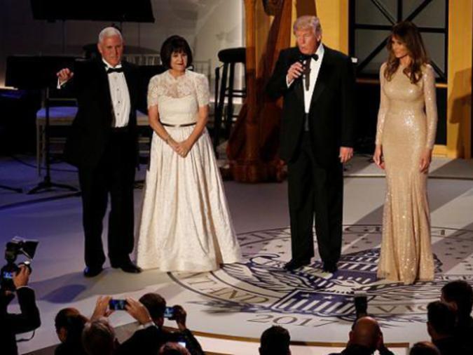 Il Presidente americano eletto Donald Trump (secondo da destra) e sua moglie Melania sul palco con il Vice Presidente eletto Mike Pence (Sinistra) e sua moglie Karen ad una cena a lume di candela di pre-inaugurazione con i sostenitori presso la Union Station di Washington, USA 19 gennaio 2017. REUTERS / Jonathan Ernst.