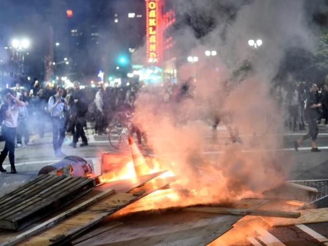 I manifestanti in rivolta dopo l’elezione del repubblicano Donald Trump come presidente degli Stati Uniti, da Oakland, California, Stati Uniti, il 9 novembre 2016. (Photo credit: REUTERS).